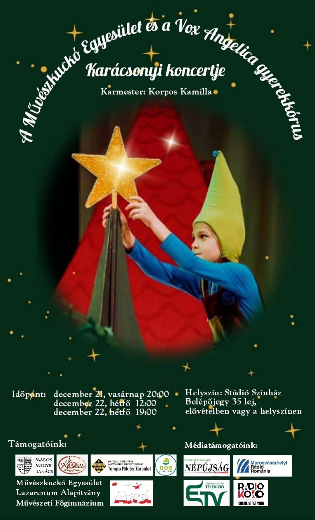 A Művészkuckó Egyesület és a Vox Angelica Gyerekkórus, mesés Karácsonyi Koncertre hívja és várja a nagyérdemű közönséget, december 21.-én, vasárnap este 20 órától és 22.-én, hétfőn 12 és 19 órától.